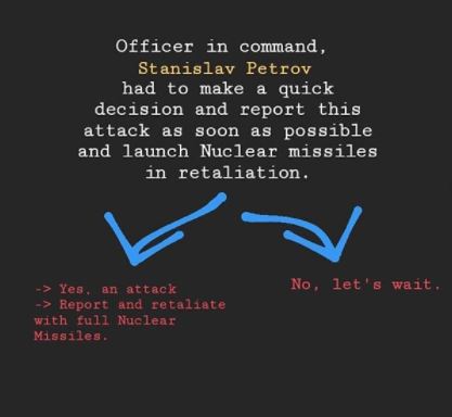When the Soviet union's missile Defence system which was the most reliable system they had with them, displayed L_A_U_N_C_H. It sensed a huge attack from the US that 5 American ballistic missiles were coming in their direction. Not one, F-I-V-E. Officer in comand Stanislav Petrov, had to make a quick decision and report this attack as soon as possible and launch nuclear missiles in retaliation. He had to make a quick decision in no time whether to report and counter attack or just wait for some time.